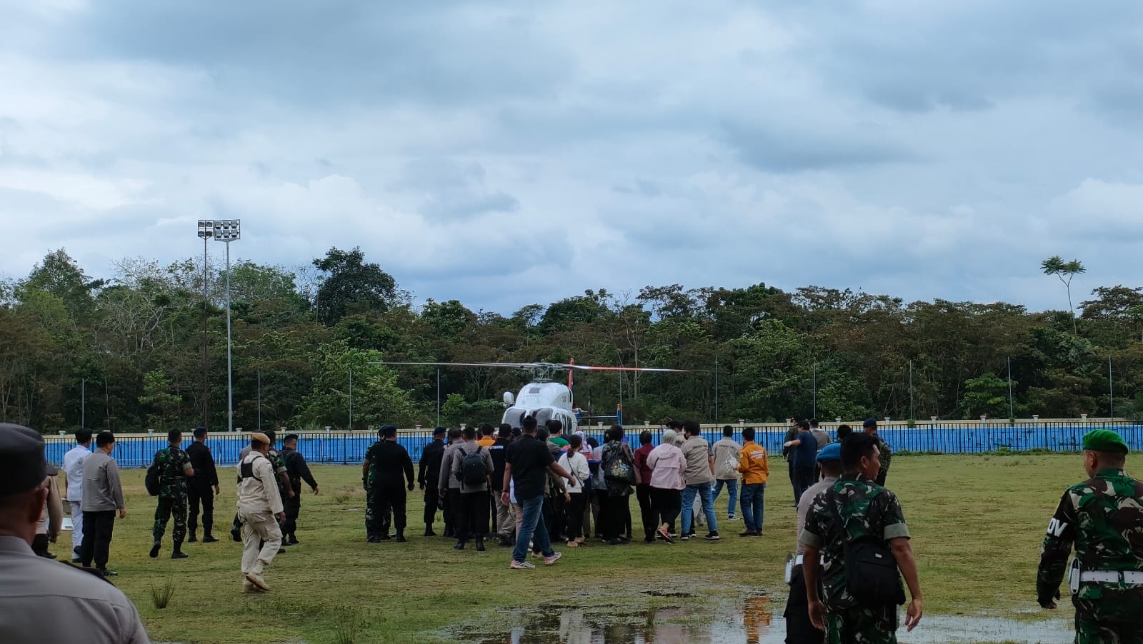 Pariwarajambi.com – Helikopter pertama yang membawa korban jatuhnya Helikopter super bell 3001 dari tengah hutan Tamiai, Kerinci berhasil mendarat di lapangan KONI Merangin, Posko tim Evakuasi.