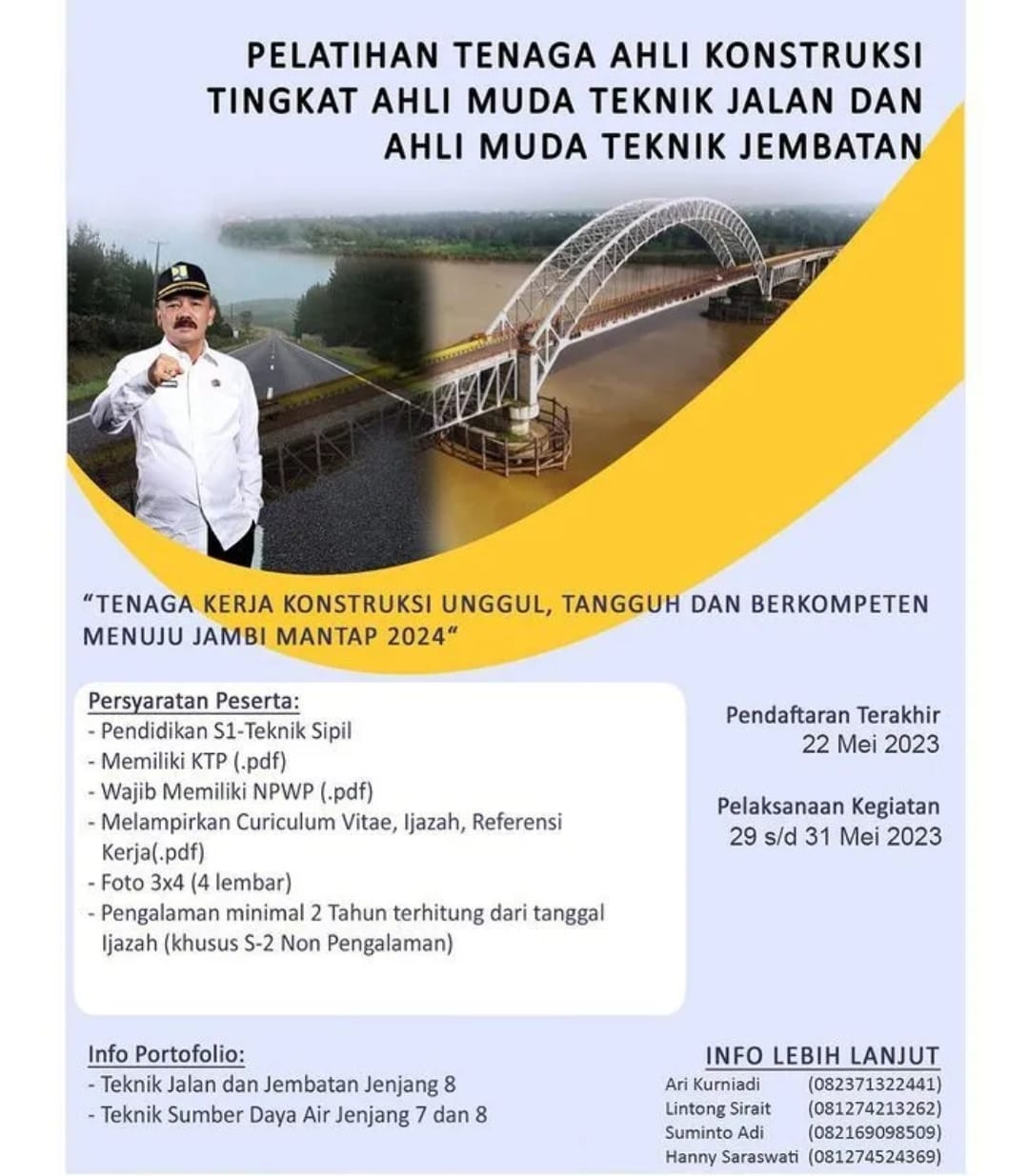 Pariwarajambi.com – Dinas Pekerjaaan Umum dan Perumahan Rakyat (PUPR) Provinsi Jambi melalui Bidang Bina Konstruksi akan menyelenggarakan Pelatihan dan Uji Sertifikasi Tenaga Ahli Tingkat Ahli Muda Teknik Jalan dan Ahli Muda Teknik Jembatan.