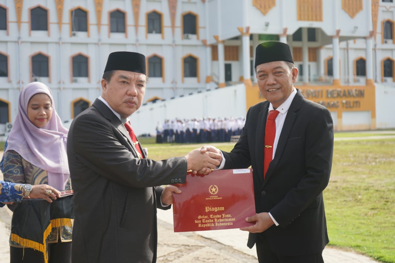 Pada upacara hari Pendidikan Nasional tersebut, Pj Bupati menganugerahkan tanda kehormatan Satya Lencana Karya Satya kepada, Sekda Merangin Fajarman yang telah mengabdi sebagai pegawai selama 30 tahun.