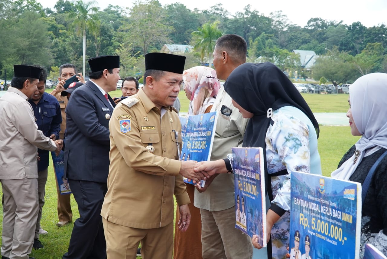 Bantuan Dumisake modal kepada 113 pelaku UMKM dan 30 kelompok tani hutan ini diserahkan Gubernur Al Haris usai pengukuhan perpanjangan masa jabatan Kades dan BPD di lapangan Gunung Kembang Sarolangun.