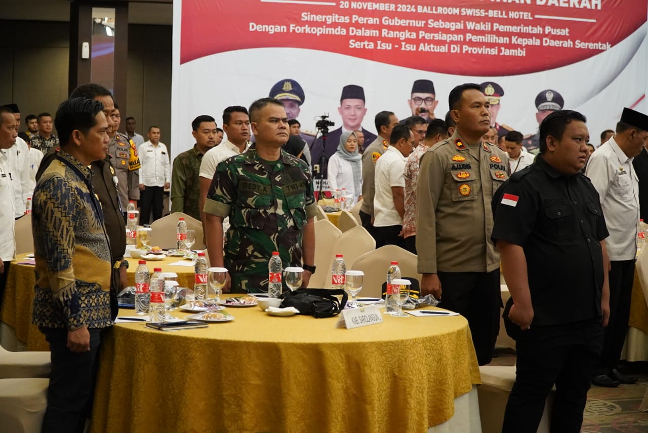 Pariwarajambi.com – Penjabat Sementara (Pjs) Gubernur Jambi Sudirman mengajak Forkopimda dan semua komponen yang berada di Provinsi Jambi bersinergi dan berkoordinasi dalam menyiapkan dan menyukseskan Pilkada Serentak 2024 di Provinsi Jambi agar berjalan dengan aman, damai dan kondusif. Ajakan tersebut disampaikan Pjs. Gubernur Jambi saat membuka Rapat Koordinasi Forum Koordinasi Pimpinan Daerah (Forkopimda) dengan tema “Sinergitas Peran Gubernur Sebagai Wakil Pemerintah Pusat dengan Forkopimda Dalam Rangka Persiapan Pilkada Serentak Tahun 2024 serta Isu-isu Aktual di Provinsi Jambi”, bertempat di Swissbel-Hotel Jambi, Rabu (20/11/2024).