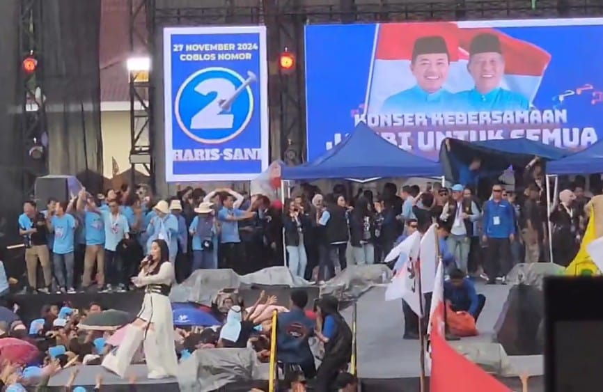 Pariwarajambi.com – Hujan yang turun tak membuat puluhan ribu massa Haris-Sani beranjak dari lapangan eks MTQ untuk mengikuti kegiatan kampanye akbar Calon Gubernur dan Wakil Gubernur, Al Haris-Sani, Kamis (21/11/2024).