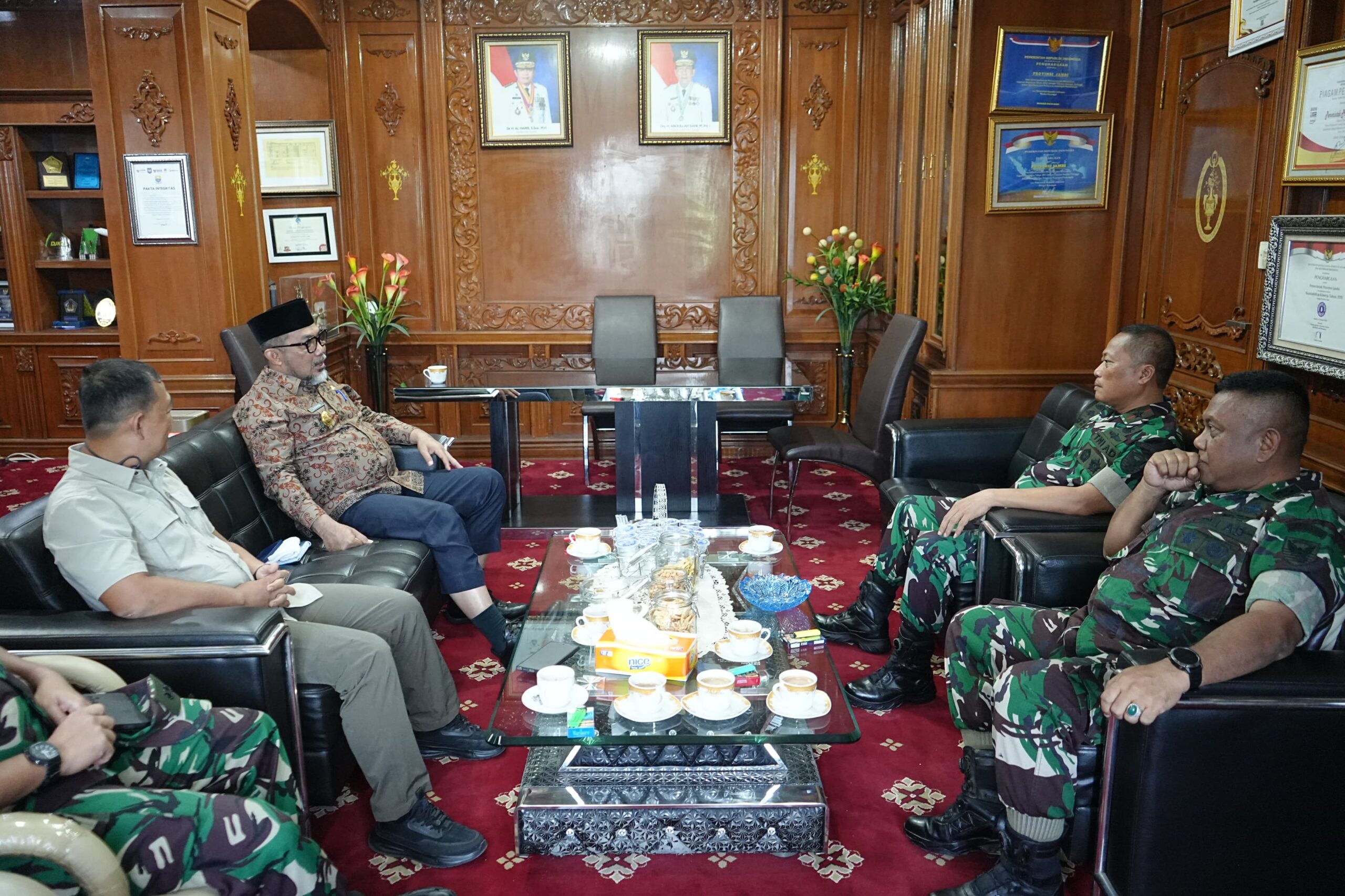 Penyambutan dan silaturahmi yang berlangsung di Ruang Kerja Sekretaris Daerah Kantor Gubernur Jambi pada Jum’at (22/11/2024) ini Danren 042/Gapu turut didampingi Kasrem 042/Gapu Kolonel Inf. Eddy Basuki, Kasi Intel Kasrem Kolonel Inf. Imasfy, S.E., dan Kasi Ops Kasrem Letkol Inf. Wisyudha Utama.